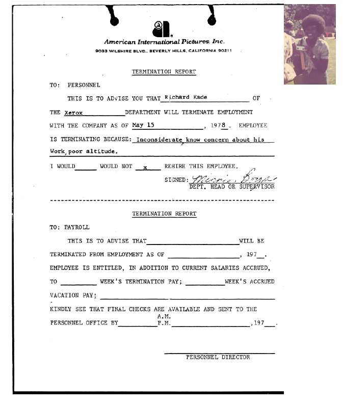 Certain obvious things about the form on the last page such as the lapse in understanding of the differences between the words “no” and “know” as well as “attitude” and “altitude” tend to yell out at the reader even four decades later. Beyond the fact that the inset photo in the upper right — taken at the American International Pictures company picnic in Malibu on 10 October 1976 — is of Minnie Boyd, a few less obvious details merit mention.